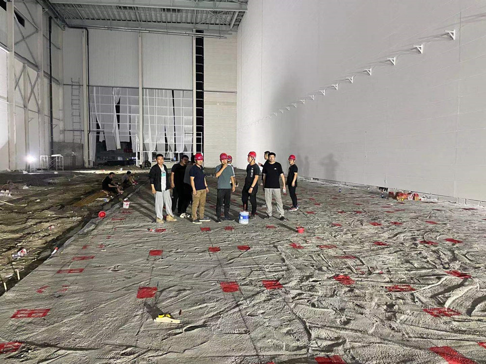 同時(shí)進(jìn)場(chǎng),分進(jìn)合擊。隔墻板安裝隊(duì)組、地坪隊(duì)組、油漆隊(duì)組等多家隊(duì)組同時(shí)入場(chǎng)施工,面對(duì)多隊(duì)組交叉作業(yè),項(xiàng)目部做好了充分的計(jì)劃安排及保障措施。4000多平方米、24米高的立面隔墻板安裝,兩家隊(duì)組從東西兩個(gè)方向同時(shí)安裝,30個(gè)工人,耗時(shí)140多小時(shí),安裝了2000多塊隔墻板。過程中,安裝隊(duì)組攻克了預(yù)制的ALC墻板訂貨周期長(zhǎng)、工人在夏季長(zhǎng)時(shí)間高空作業(yè)等各種困難。油漆隊(duì)組緊跟安裝隊(duì)組,隔墻板裝好一個(gè)工作面就緊跟另一個(gè)工作面。墊層、防潮膜、保護(hù)層、放線、扎鋼筋、鐵件預(yù)埋、關(guān)模、澆筑地坪……在有限的時(shí)間里道道工序,層層把關(guān),都有條不紊地順利完成。