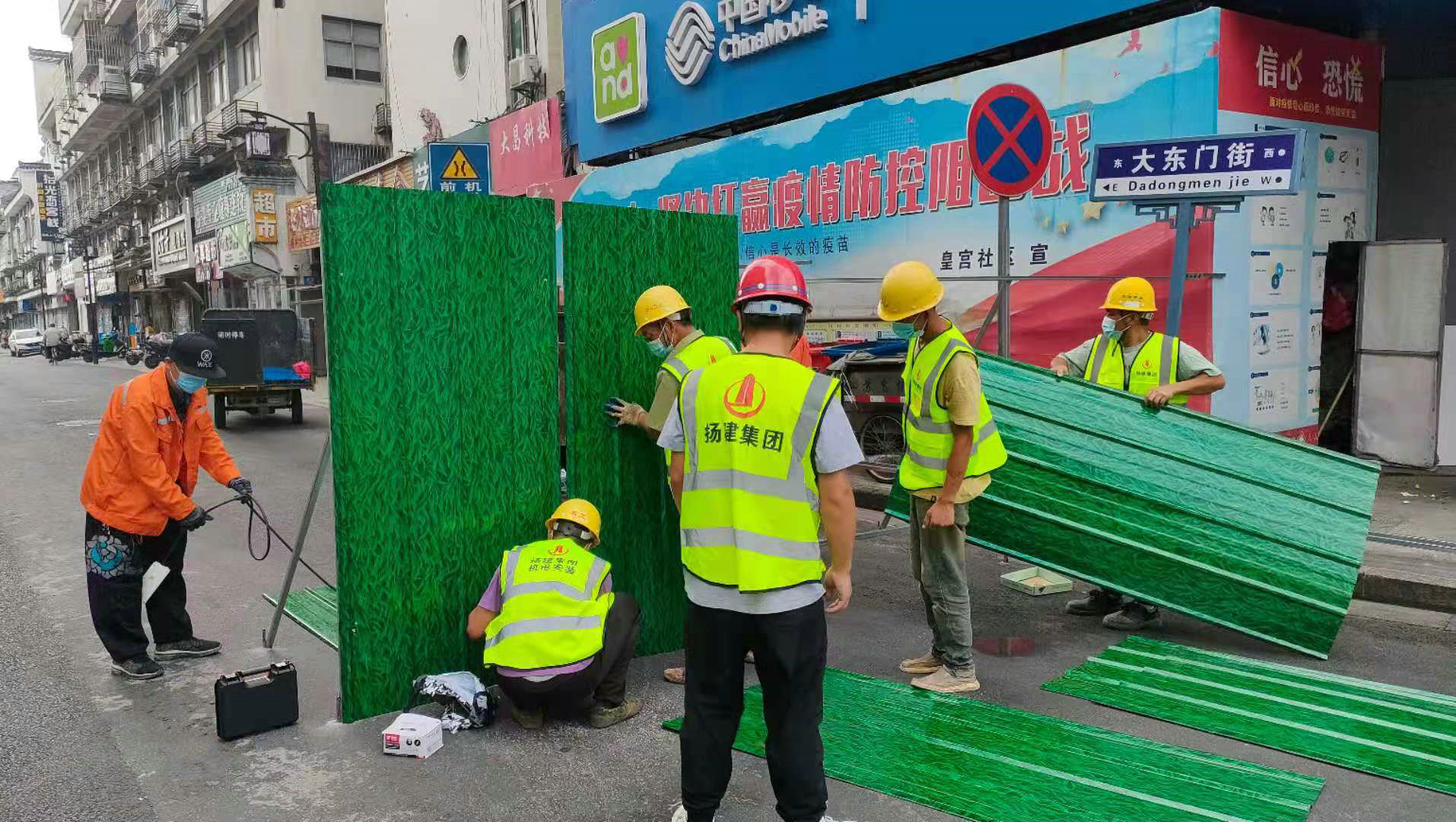 同日,因疫情防控網(wǎng)格化管理要求,需要在東關街道小區(qū)出入口及部分道路岔口設置圍擋。在接到東關街道求援后,我集團旗下江蘇運揚工程建設有限公司(原“新?lián)P建”)立刻安排九龍八期項目部八名工人,在韓璇卿、王云兩同志帶領下趕往現(xiàn)場投入緊張施工,并于當日順利完成了突擊任務。