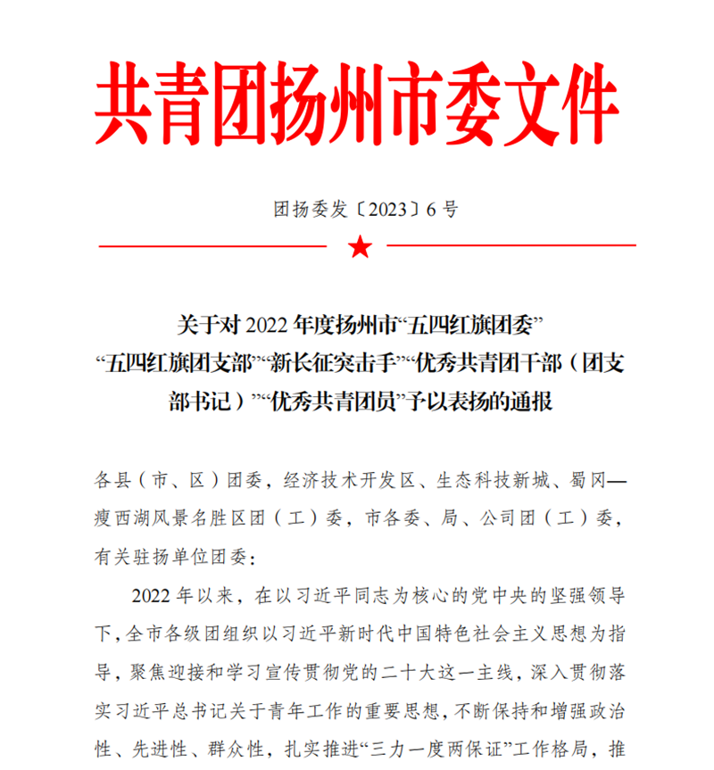 揚建網(wǎng)訊 近日,揚州團市委對2022年涌現(xiàn)出的先進集體和先進個人進行了表彰,揚建集團房軍同志榮獲揚州市“新長征突擊手”稱號。