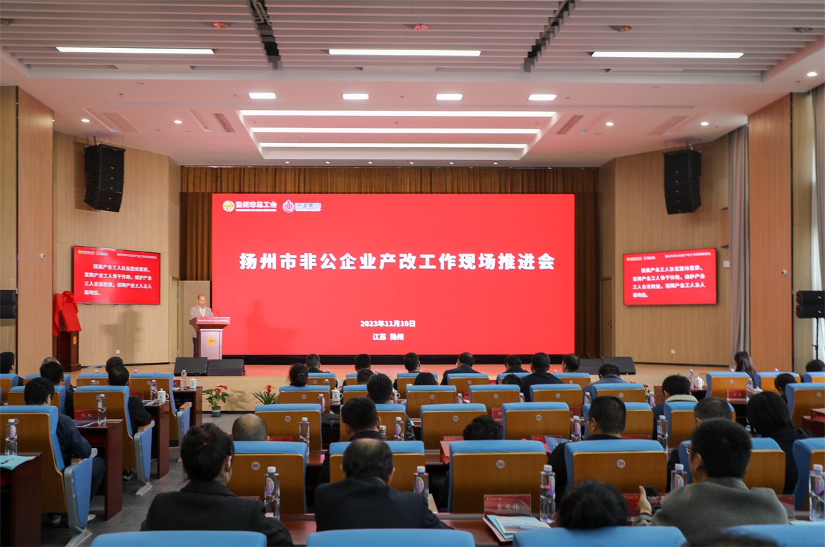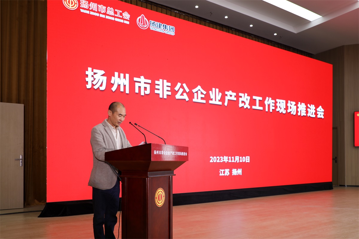 揚(yáng)建網(wǎng)訊 11月10日下午,揚(yáng)州市非公企業(yè)產(chǎn)改工作現(xiàn)場推進(jìn)會在揚(yáng)建集團(tuán)產(chǎn)業(yè)園舉行。市人大常委會副主任、黨組副書記、市總工會主席韓方,市總工會黨組書記、副主席蔣元峰、副主席韓士軍、孫凌雷、楊浩、伍瑞慶,揚(yáng)建集團(tuán)黨委書記、董事長康往東等領(lǐng)導(dǎo),以及市產(chǎn)改聯(lián)席會議成員單位、市總工會各部室、產(chǎn)業(yè)工會和直屬單位、各縣(市、區(qū))總工會有關(guān)負(fù)責(zé)人,非公企業(yè)、工匠學(xué)院、社會組織代表,揚(yáng)建集團(tuán)職工代表共200余人參加活動。