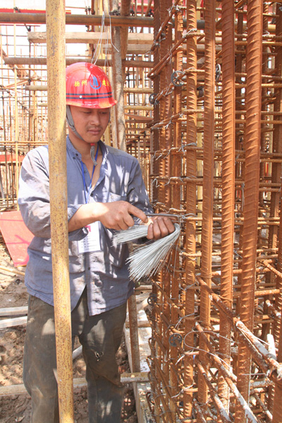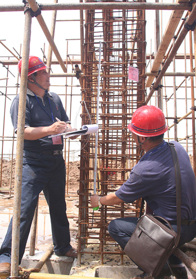 考核現(xiàn)場(chǎng)地劃分為A、B、C、D、E五個(gè)賽區(qū),每個(gè)賽區(qū)的企業(yè)考評(píng)專家、考評(píng)監(jiān)督員和考評(píng)員根據(jù)技師考核標(biāo)準(zhǔn)負(fù)責(zé)對(duì)賽區(qū)內(nèi)的8名選手進(jìn)行現(xiàn)場(chǎng)考評(píng)。選手按照考核項(xiàng)目要求,在規(guī)定的時(shí)間內(nèi)依據(jù)現(xiàn)場(chǎng)提供的施工圖紙,完成框架柱箍筋數(shù)量計(jì)算、箍筋綁扎、安放保護(hù)層、清理現(xiàn)場(chǎng)等操作。賽前,企業(yè)考評(píng)專家做了技術(shù)和安全交底,每位選手都將施工圖紙內(nèi)容牢記于心,隨著裁判長(zhǎng)的一聲令下,所有選手爭(zhēng)相步入指定位置,迅速投入到了競(jìng)賽中:量間距、套箍筋、鋼筋綁扎、安放保護(hù)層……,每位選手都嫻熟地運(yùn)用著手中的工具搶時(shí)間、拼質(zhì)量,顯敏捷身手。競(jìng)賽過程中,雖然頭頂烈日,但絲毫沒有影響到選手的發(fā)揮,整個(gè)競(jìng)賽現(xiàn)場(chǎng)秩序井然。